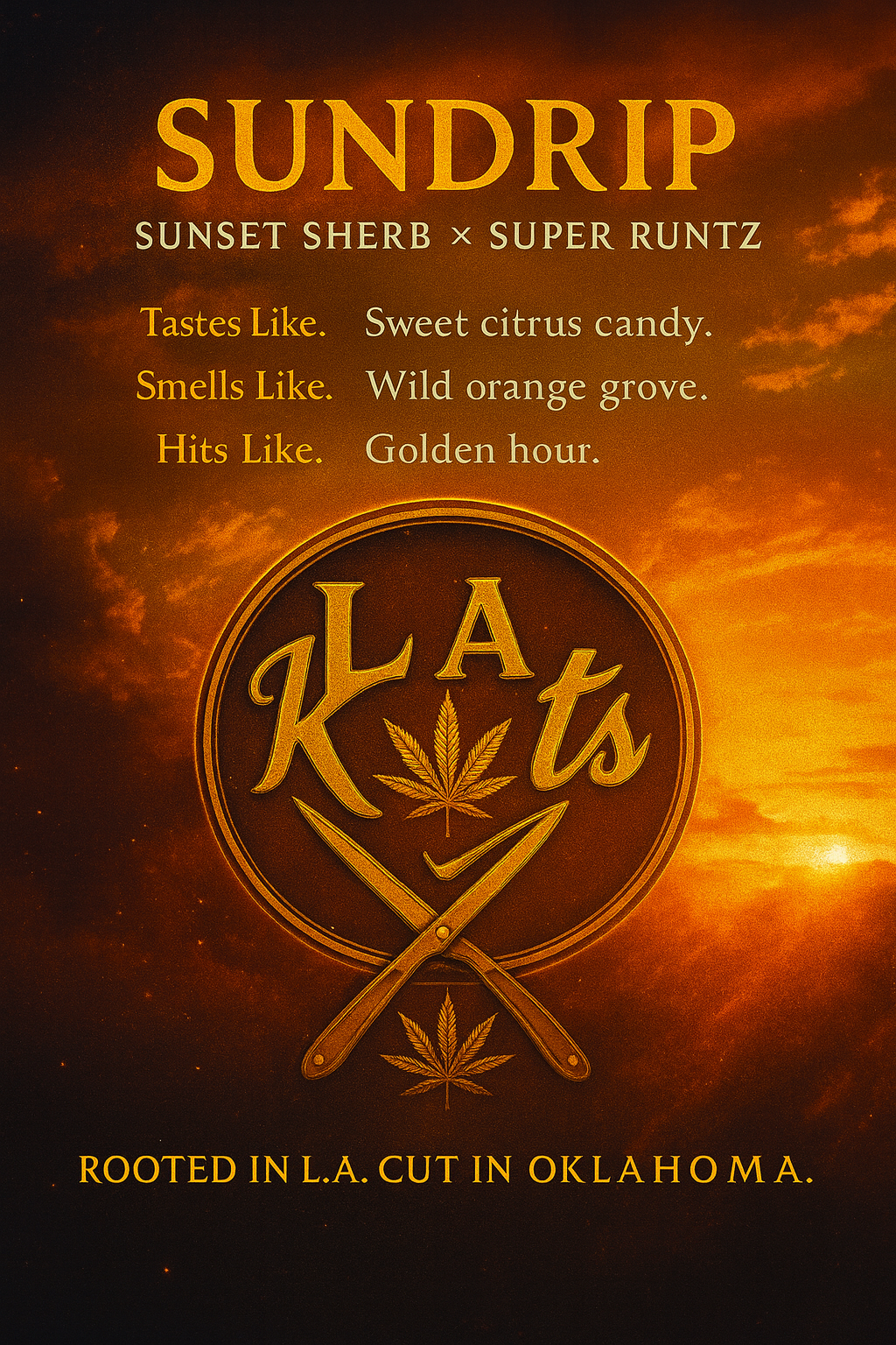 SUNDRIpUP CLOSE IT BURNS BRIGHTER 28-33% THC Dripping citrus gas and sugar fire. Hybrid | 8-9 weeks | 80-90 g/ft² Stacks clean.resin heavy.easy cut.
